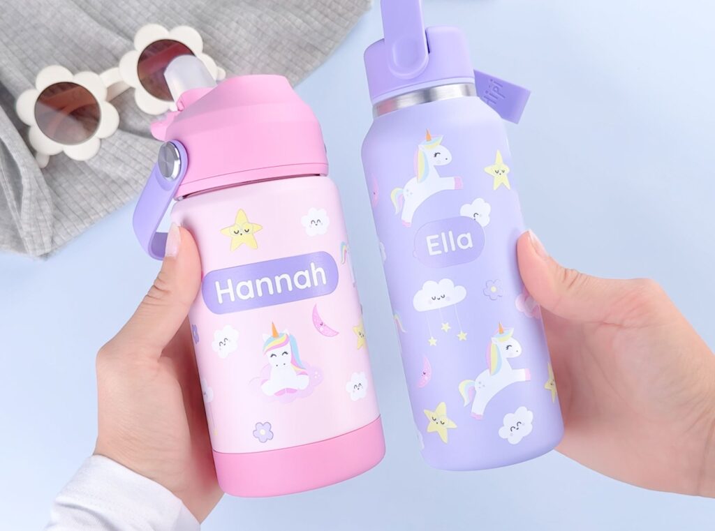 En rosa og en lilla drikkeflaske med navn og enhjørninger- laget for barn